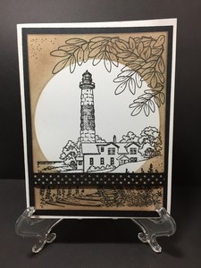 This could be a masculine card or for any occasion. I stamped a lighthouse and then used a post-it note to cover the area I wanted to keep white. I then proceeded to use a light brown ink and in circular motions color in the area I didn’t want to stay white. I used a small ribbon and left the sentiment off but could easily be a Father’s Day, birthday or even a retirement card for someone.
