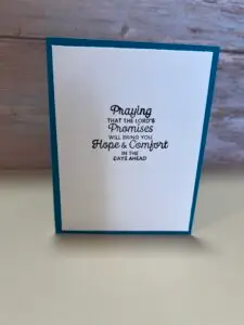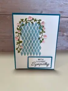 I used blue card stock as the base and then die cut the white window to show the blue shining thru. I die cut the small pink flowers and vine and added the flowers around like a trellis. I stamped with deepest sympathy on the front and add a small sentiment on the inside.