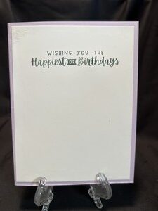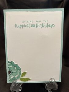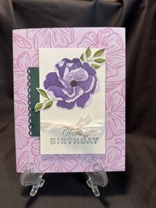 For these two cards I used the same scrapbook paper and cut out some more flowers. I first stamped the card stock with a flower outline. Next I stamped Happy Birthday on a small white card stock and then adhered a flower and some leaves to the white card stock.  I added a small green border along the side of the white paper and tied a seam binding bow to finish off the front.  For the inside I stamped a birthday greeting and added a scrap of a flower along the bottom. I left the flower off of the purple card on the inside.
