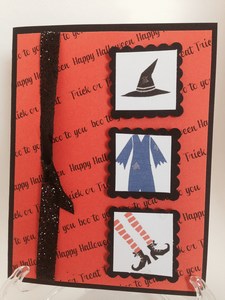The fall air is upon us now and it is only a matter of time before the holidays are here. I have a few more Halloween cards to show you but I have found this set to be so very versatile that I just keep coming back to it. The first card I made without the broom and I thought it was just to empty of space on the right so I added the witches broom. On the other one I moved everything over to the right side and added some sparkly black ribbon on the left. the background I made myself.