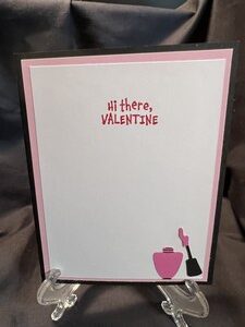 I die cut some simple shapes to look like a compact of eye-shadow and added a tube of lipstick on the bottom. Simple sentiment of Happy Valentine’s Day.