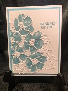 For this card I used both the dies and the stamps in a light blue ink. I used the first skinny overlay in white cardstock and stamped my flowers off to the side. Added the sweet little sentiment Thinking of You and the card is complete.