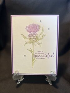I stamped the thistle in a light purple ink and then colored the leaves a light green.  I stamped a sentiment on the right side and another one on the inside. To finish off the card I added a couple of rhinestones and some winkastella for some shimmer.