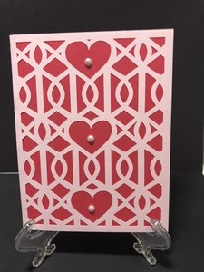 My next card has three hearts in the center with an intricate cutout all around.  I added a couple of pearls in the center of the hearts to give it a little bling.