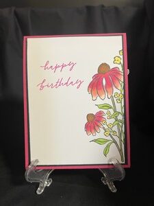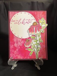 I used alcohol markers to color in the flowers and die cut a circle for the front. I then stamped Time to celebrate in the circle and then stamped happy birthday on the inside.