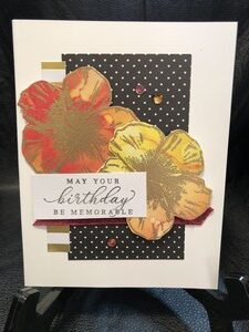 This card was created using some of the items from the June 2020 kit. I call my card tropical because it reminds me of Hawaii. The picture is a little hard to see but I used gold embossing ink on the flowers and added a couple of iridescent sequins for some sparkle.