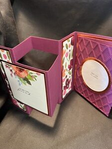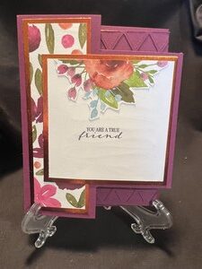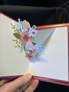 The card starts out as a fun fold but as you open it there is a cut out and finally as you open the last part the flowers pop up at you.