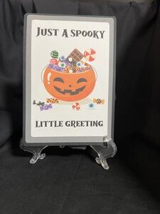 This card turned out quite well. The saying let’s you know there is a surprise inside. I used the print and cut feature in Design Space this time for the front and the characters inside. The inside has a simple Trick or Treat message.