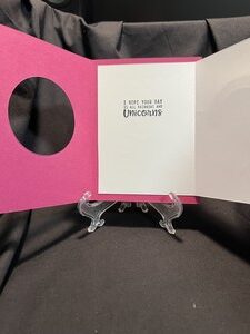 I die cut a circle in the center to allow for the stamped rainbow and unicorn to peek through. The second photo shows the complete design and opens from the right side instead of the left. The final photo shows how the card has a sentiment and room to write a message. This would make a great card for kids or anyone who enjoys unicorns and magic.