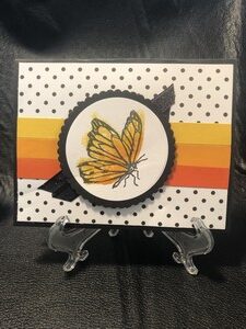 Here is a card that could be used for any occasion. The butterfly is stamped like water-coloring, which means that it is not perfectly colored in. I added some black ribbon behind the circle and three strips of yellow and orange cardstock to give a little pop of color.