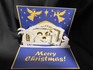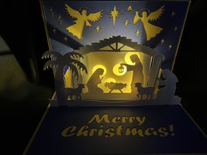 Today I have a card which took a lot of time to make but is so well worth it. The front of the card has the 3 Kings heading to see baby Jesus. The inside has the manger scene with Joseph, Mary, Jesus, a shepherd and angels announcing the birth of Jesus. The final picture shows where I added a tealight to the back of the scene. There is plenty of room to write a private message on the back.