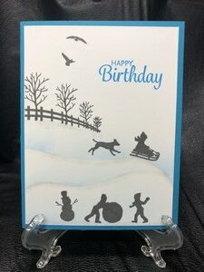For this card I wanted to make a winter birthday card.  I have several people who have birthdays in the cold winter months and thought this would be perfect. You can’t tell from the picture but where the snow is hilly I added some glitter for some sparkle.