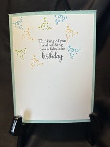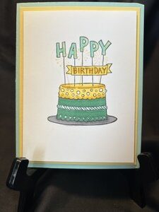 I stamped the cake and then colored it in with copic markers of yellow and green, I stamped some sparklers on the cake in the background if you look real close you can see them. For the inside I stamped confetti all around the sentiment to finish off the card.