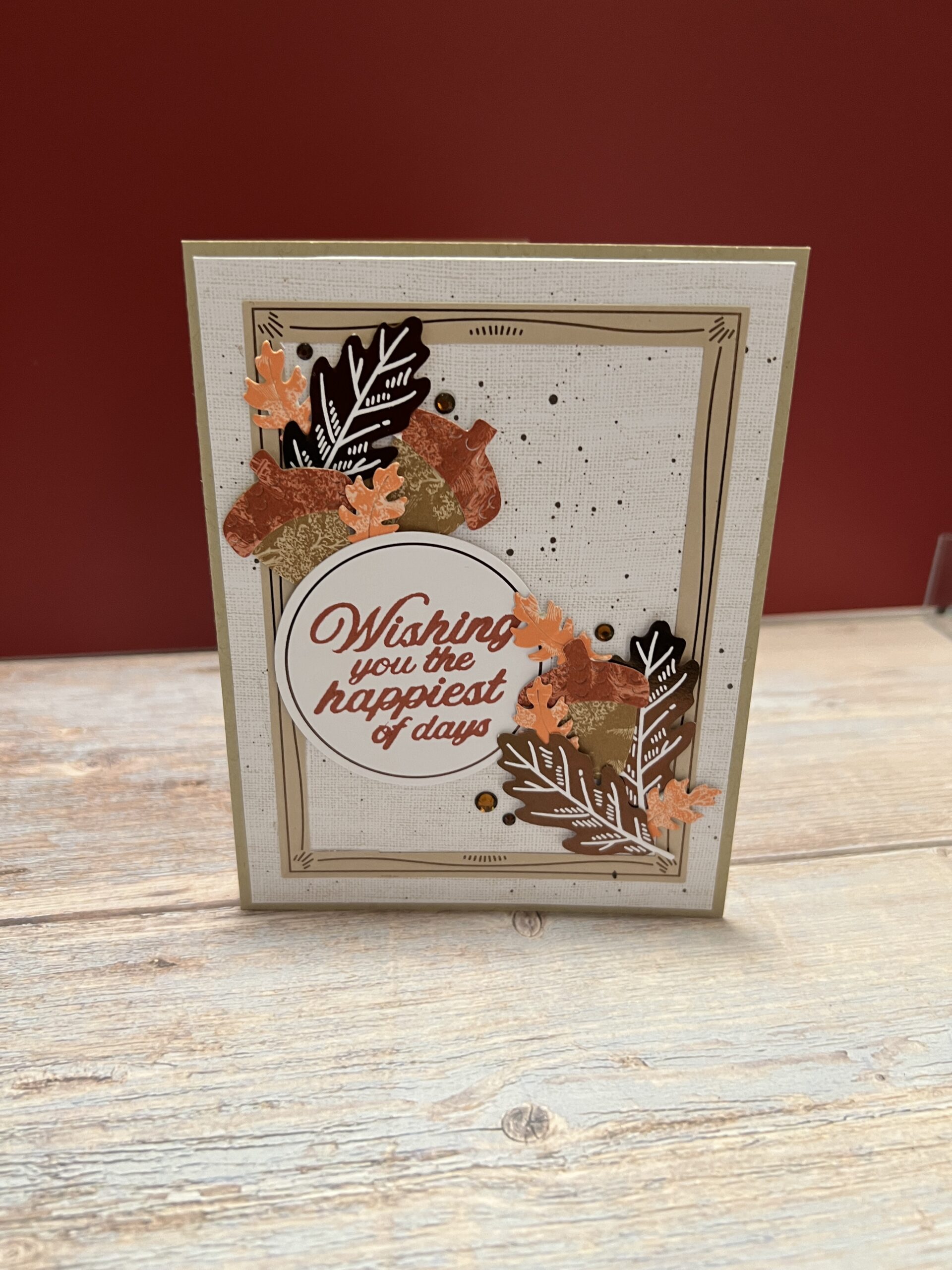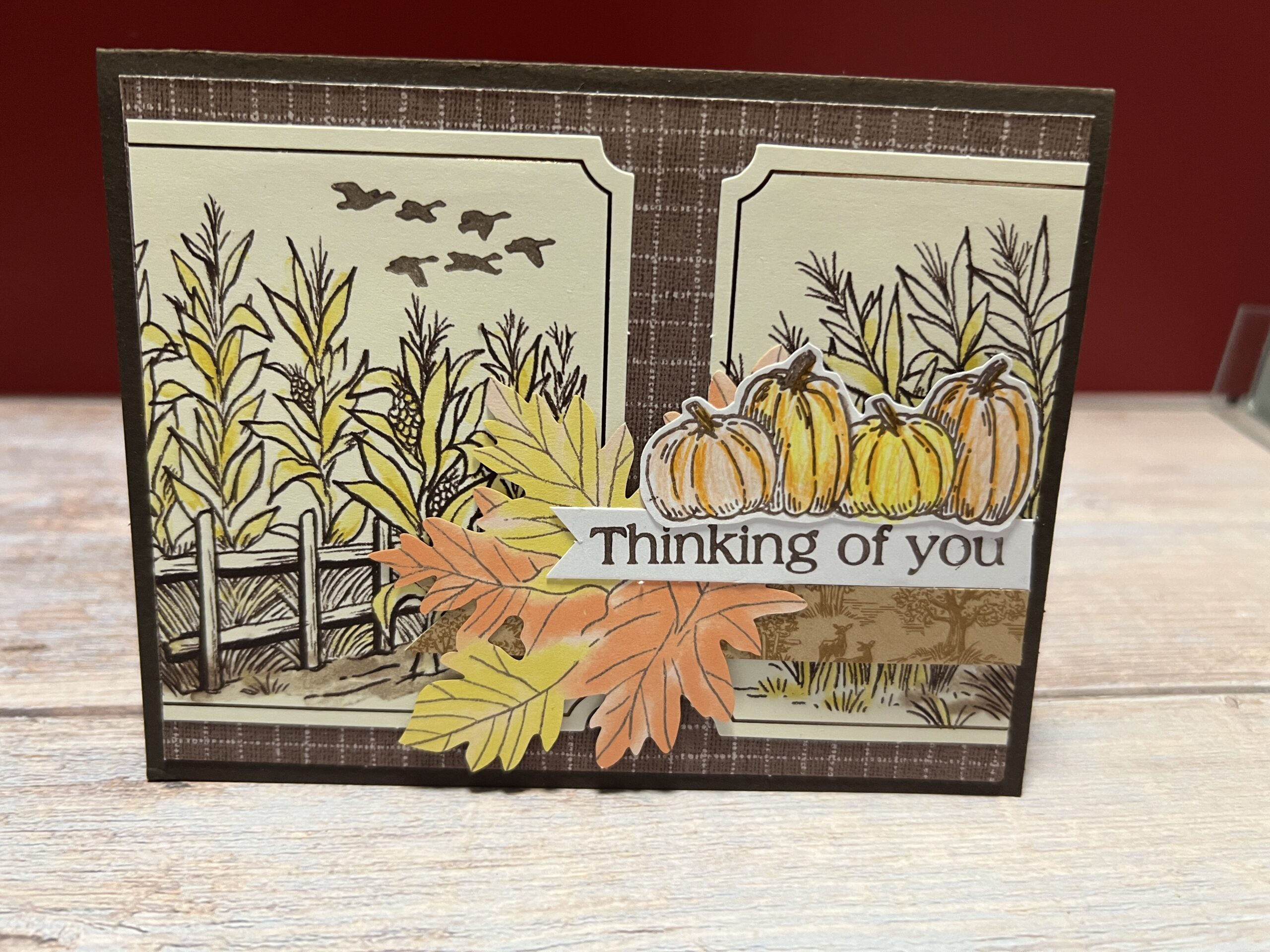 This card could easily be a birthday card or a Thanksgiving card. The colors just scream fall to me. I first stamped Wishing you the